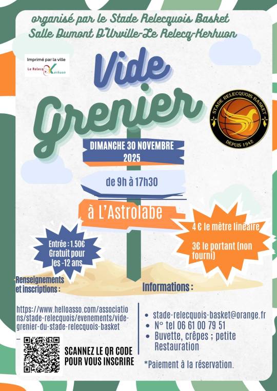 Inscription possible sur helloasso :https://www.helloasso.com/associations/stade-relecquois/evenements/vide-grenier-du-stade-relecquois-basket